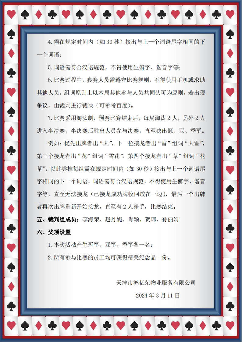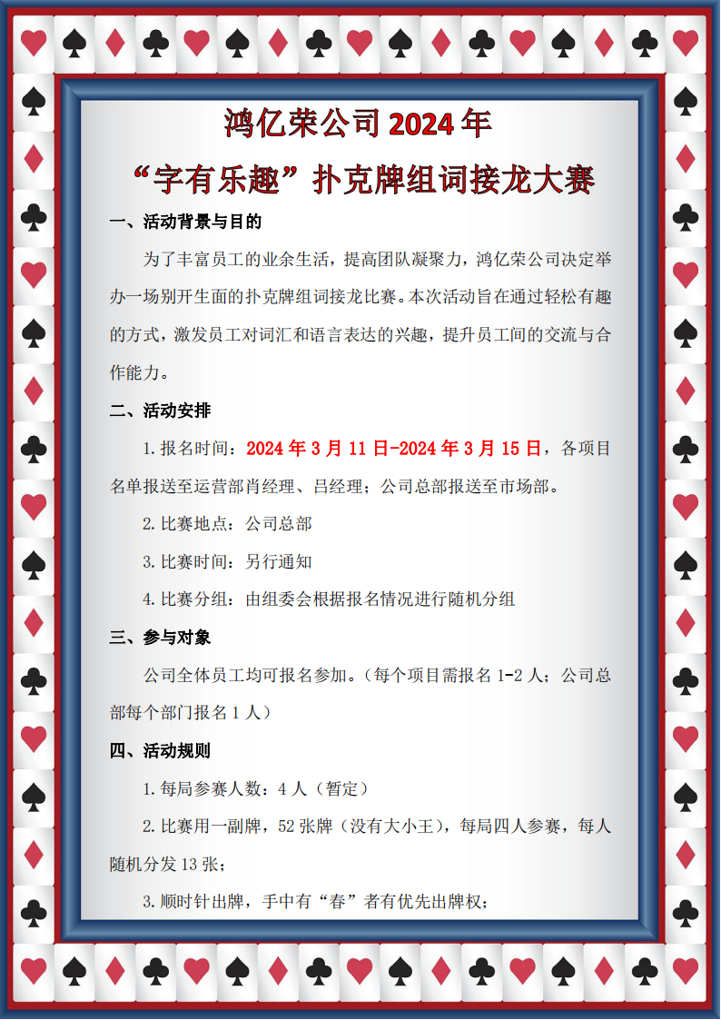 鴻億榮公司2024年“字有樂趣”撲克牌組詞接龍大賽通知